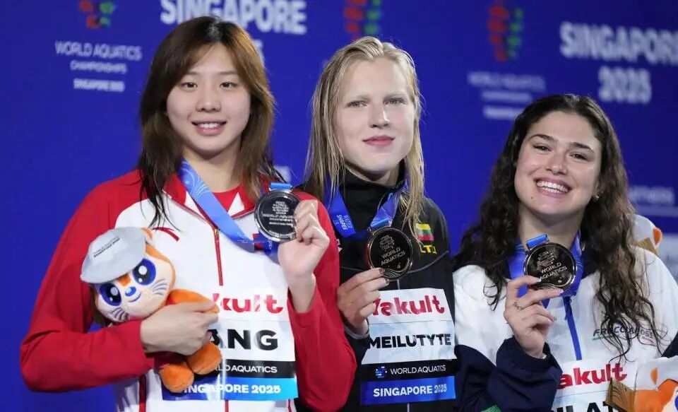 新加坡世锦赛女子50米蛙泳决赛,立陶宛世界纪录保持者梅卢蒂特(中)以29秒55实现四连冠,唐钱婷获得亚军,成绩为30秒03。意大利皮拉托(右)获得铜牌。图片