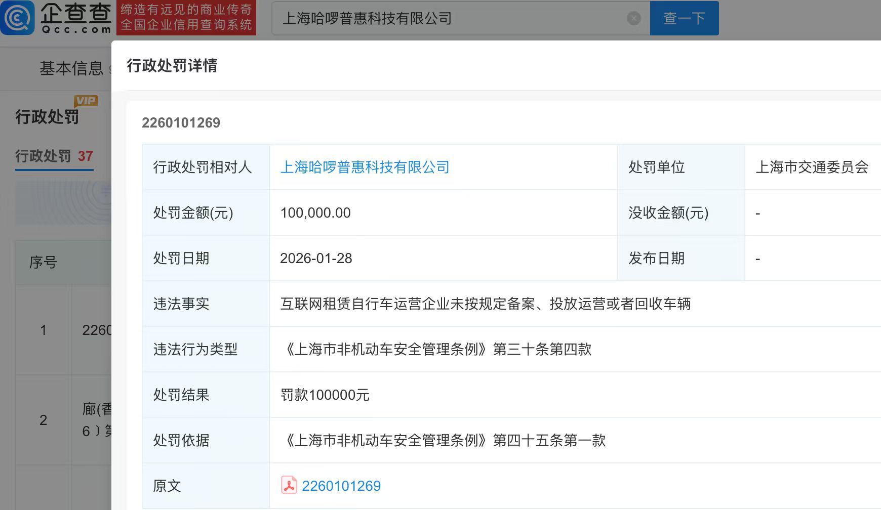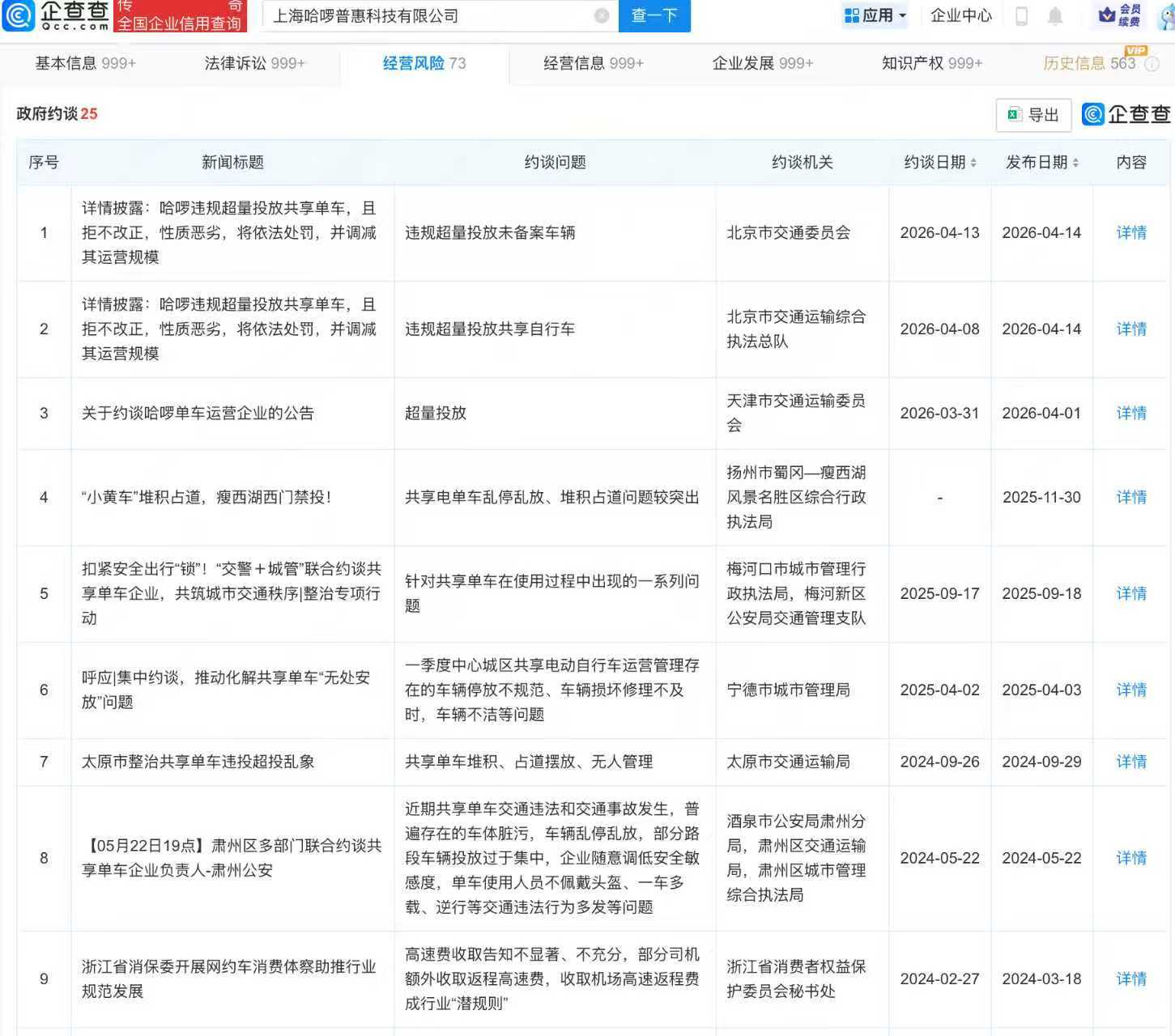 企查查APP显示,上海哈啰普惠科技有限公司成立于2016年,注册资本44亿元,其在业存续分支机构达185家。信息显示,该公司已被政府约谈25次,约谈问题包含共享单车堆积、占道摆放、无人管理;超量投放;违规超量投放共享自行车等。此外,今年1月28日,该公司因未按规定备案、投放运营或者回收车辆被行政处罚,处罚金额10万元。